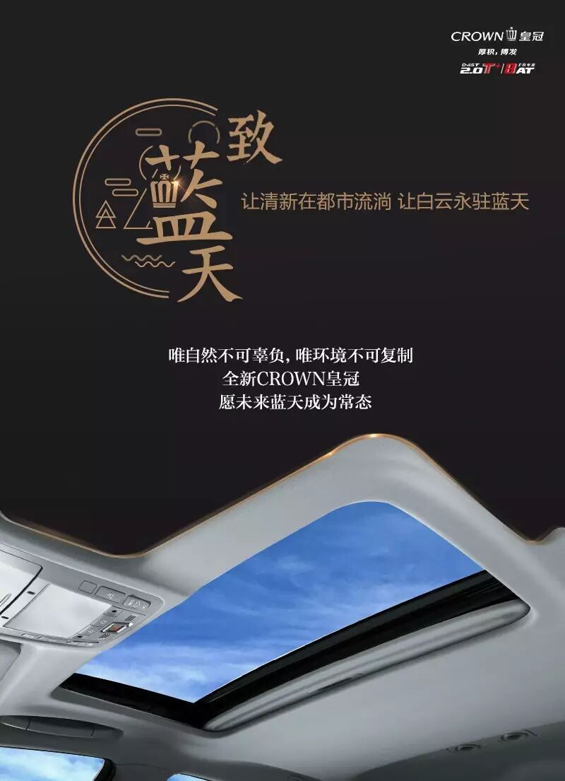 全新CROWN皇冠也将努力实现“科技含量更高”、“资源消耗更低”、“环境污染更少”,在节能减排,绿色出行方面做出自己的贡献,让蓝天成为一种常态,让“APEC蓝”“阅兵蓝”出现在每一个晴天!