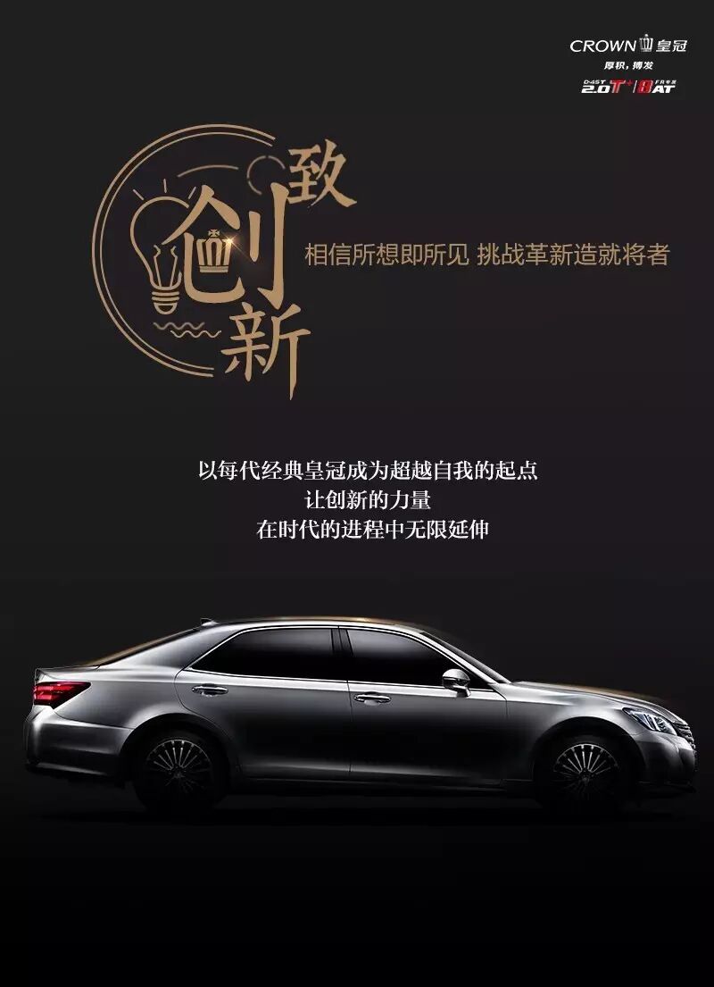 全新CROWN皇冠也一直以“挑战革新”作为研发理念,无论是外观的大胆革新,动力系统的全面升级,还是人性化科技理念的应用,全新CROWN皇冠始终以“创新精神”树立先行者的姿态,走在时代的前列,为时代精英们带来完美的驾乘体验。