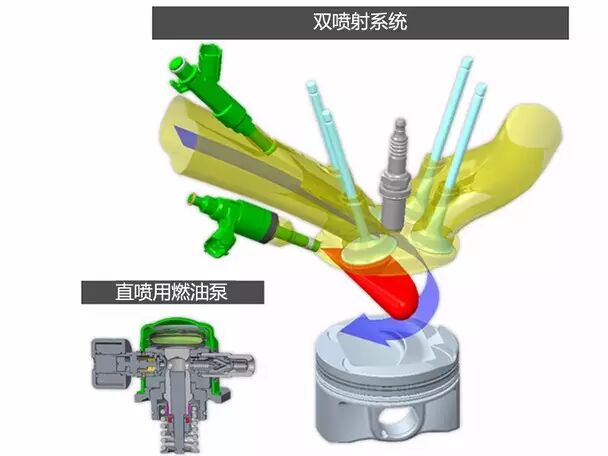 双喷射这个技术就不多说了,不是啥太新鲜的东西了。当然了,它也是丰田首创的。双喷射顾名思义,就是缸内直喷+歧管喷射。缸内直喷可以精准控制油量,但冷启动时油气混合效率低下,且容易造成积碳。歧管喷射则可以弥补上述不足。