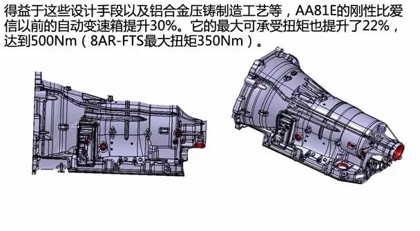 它使用了双级行星齿轮组(辛普森式结构)和拉维娜行星齿轮组,双级齿轮组在本篇文章中很难讲清楚,改日有时间咱们单说,不过首先您得知道什么是行星齿轮组。变速箱同时还进行了强化,并降低了重量,可承受扭矩也进一步提升。