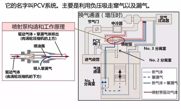 关于为何不烧机油以及减少涡轮增压发动机的机油消耗量这个问题,丰田是这么解决的。首先,做工好,虽然听着像废话,不过还是要说的。技术方面则是在机油喷射冷却活塞时可以更好的判断时机,在低负载时,机油就不喷了,机油消耗量减少。第二,减少涡轮增压时的窜气漏气现象,从而控制燃烧室的压力以及机油劣化。那么如何减少涡轮增压的窜气漏气呢?请看下面这张非常复杂的解析图。建议对这方面没兴趣的朋友可以直接略过了。