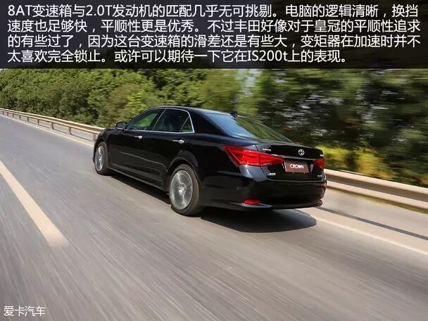 那些担心皇冠换装四缸增压发动机会破坏其稳重线性表现的朋友们可以把心放在肚子里了。除了声音没有此前的V6发动机那么浑厚以外,整体的表现平顺得基本让你无法察觉到这是一台涡轮增压发动机。它的输出实在是太线性了,对比我自己驾驶的大众2.0T发动机来看有着极大的反差。而它优异的静谧性则很大程度上掩盖了涡轮发动机的声音特性,我相信大部分人开上这台车以后都会有开自然吸气车型的错觉。