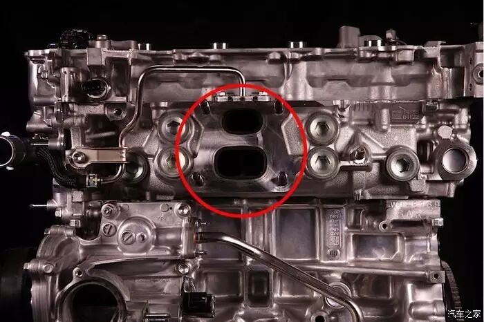 下图为:丰田的2.0T,排气歧管和缸盖成为一体,排气歧管经液体散热后直接变为两个排气出口与双涡管增压器连接。其中大口为近端2、3号气缸排气,小口为远端的1、4缸排气。所以在这个引擎上,你看不到BMW引擎上的那4根排气歧管,高温也可以被更好地抑制。
