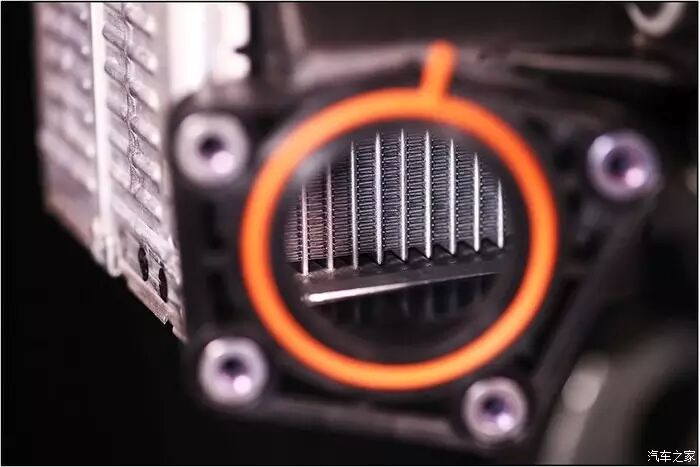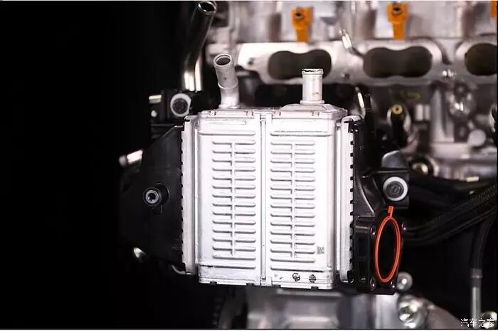 下图为丰田2.0T8AR涡轮增压引擎的液体循环中冷器,相对于普通廉价的风冷中冷器,液冷中冷器的效率更高,进气温度也更稳定。局部放大图可看到密布的冷却水道分布。