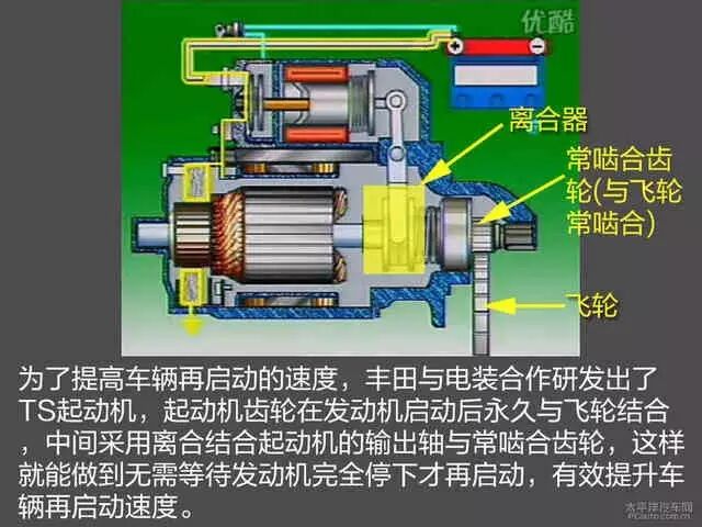 当然,实际的工作情况比上面的解释要复杂一点。TS起动机里面有两个螺线管,分别独立控制小齿轮的推出和起动机的运转。车辆在第一次点火时小齿轮推出啮合飞轮,在行车过程中启停时,小齿轮则不会收回,一直与飞轮啮合,起动机使用离合器与飞轮分离结合。到最后停车熄火时小齿轮才收回。