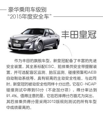 2015年11月12日,中国汽车安全领域权威C-NCAP发布了中国“2015年度安全车”评选结果。皇冠脱颖而出,成为唯一入选中国“2015年度安全车”的豪华乘用车!