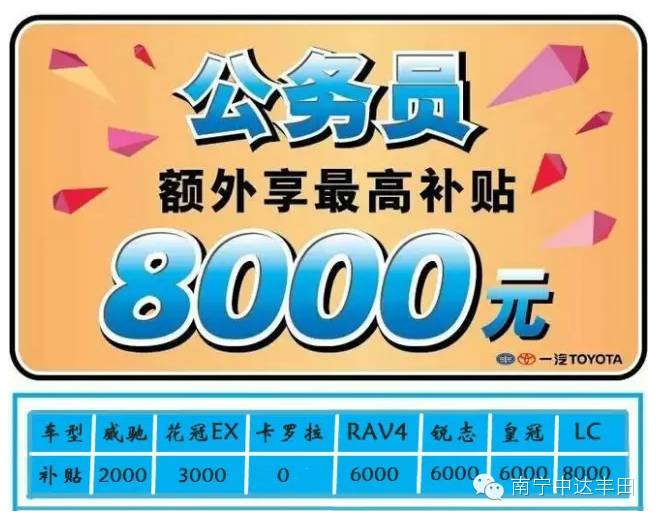 南宁中达丰田“公务员购车特惠专案”具体如下: