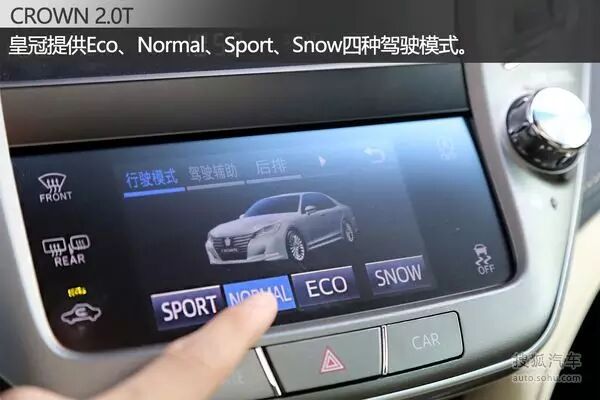 皇冠提供Eco、Normal、Sport、Snow四种驾驶模式。Eco是经济也是最为舒适的驾驶模式,变速箱档位较高、发动机转速低,同时油门迟缓,空调的功率也会被降低,从而照顾燃油经济性。Normal是最顺畅也是最自然的驾驶方式,在试驾的过程中,我多数时间都是选择这一模式。Sport模式下,变速箱全程保持较低档位,发动机怠速会高一些,油门更加灵敏,车身动态响应快。Snow模式可以通过控制扭矩输出,避免在湿滑路面打滑,这个模式对于后驱车来说,还是十分必要的。