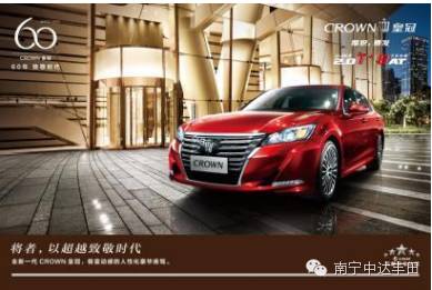 60周年的超越。 即刻,未来“驾”到!12月 10日起来南宁中达试驾全新皇冠2.0T就有机会获得贺岁档电影“老炮儿“电影票兑换券、新秀丽新款商务多功能双肩包、皇冠定制护航应急套装、最高5000元购车抵用券等丰厚豪礼!