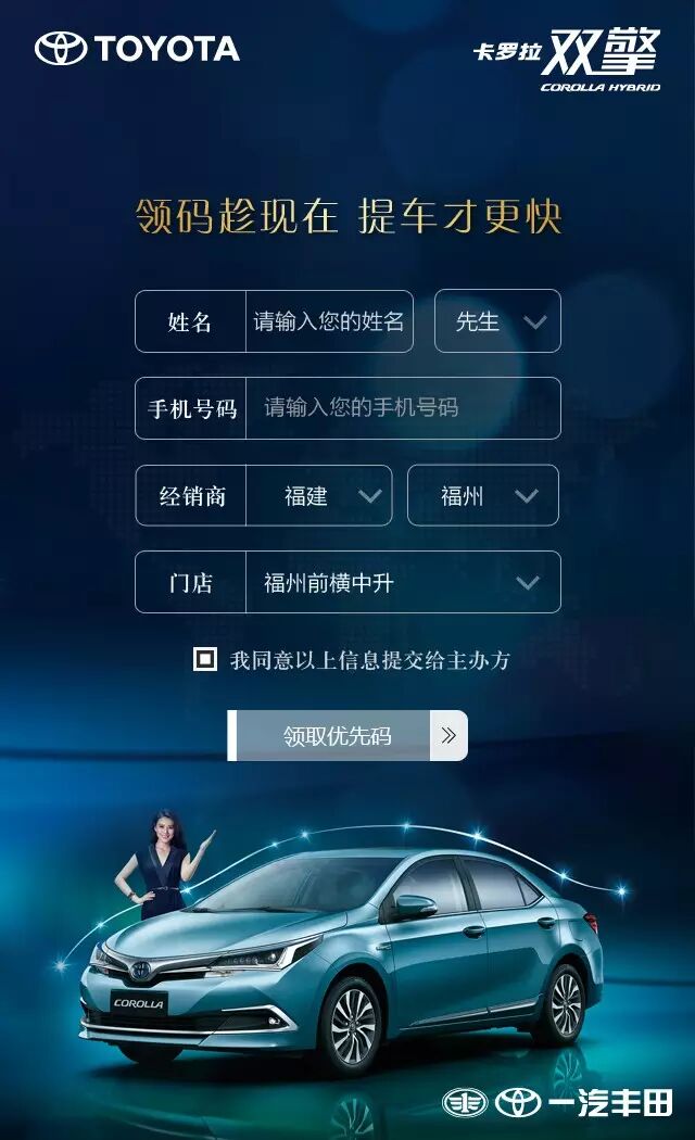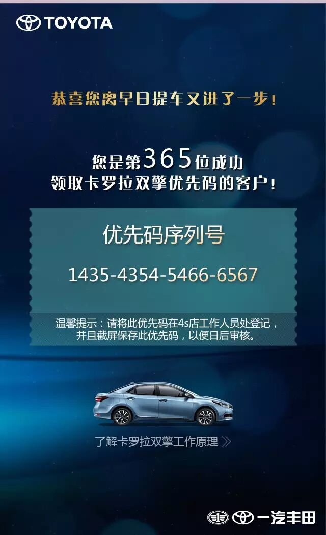 “您是第365位成功领取卡罗拉双擎优先码的客户!”