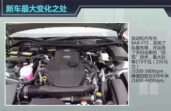 说起这台2.0T发动机,其实我们并不陌生,它早已经搭载配备在了丰田的多款车型上,例如汉兰达以及雷克萨斯NX200t,只是功率调教有所不同而已。代号为8AR-FTS的发动机是此次新车最大的亮点,为了满足皇冠前置后驱的需求,其采用了纵向布置,并运用了丰田全新的“四双”技术,即双喷射(缸内直喷+进气歧管喷射)、双涡管涡轮增压、双循环(奥拓循环+阿特金森循环)、以及双VVT-i(W)系统。发动机最大功率为173千瓦(235马力)/5200-5800rpm,峰值扭矩为350牛·米/1650-4400rpm,数据表现与同级别车型相比可以说是中规中矩,但优在技术运用的先进程度上,并且增加发动机启停系统。8速手自一体变速箱也是首次与这款发动机相搭配。该款变速箱还同样应用于更豪华的雷克萨斯LS系列车型上,多挡位意味着变速箱有着更绵密的尺比,换挡动作更加平顺,顿挫感小等优点。