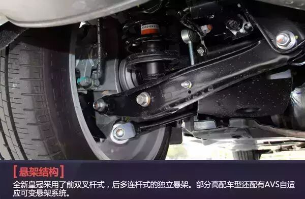 悬架方面,全新皇冠采用的是前双叉杆式独立悬架,后多连杆独立悬架的组合,部分高配车型还配有AVS自适应可变悬架系统,该系统可以在持续遇到颠簸或起伏时,对减震器的阻尼进行调整,从而保证驾驶时的稳定性与操控性。虽然车长超过5米,但实际开起来的感受还是很轻松的,不会让你因为车大而感到难以驾驭,即便是女性朋友,也很容易掌控。