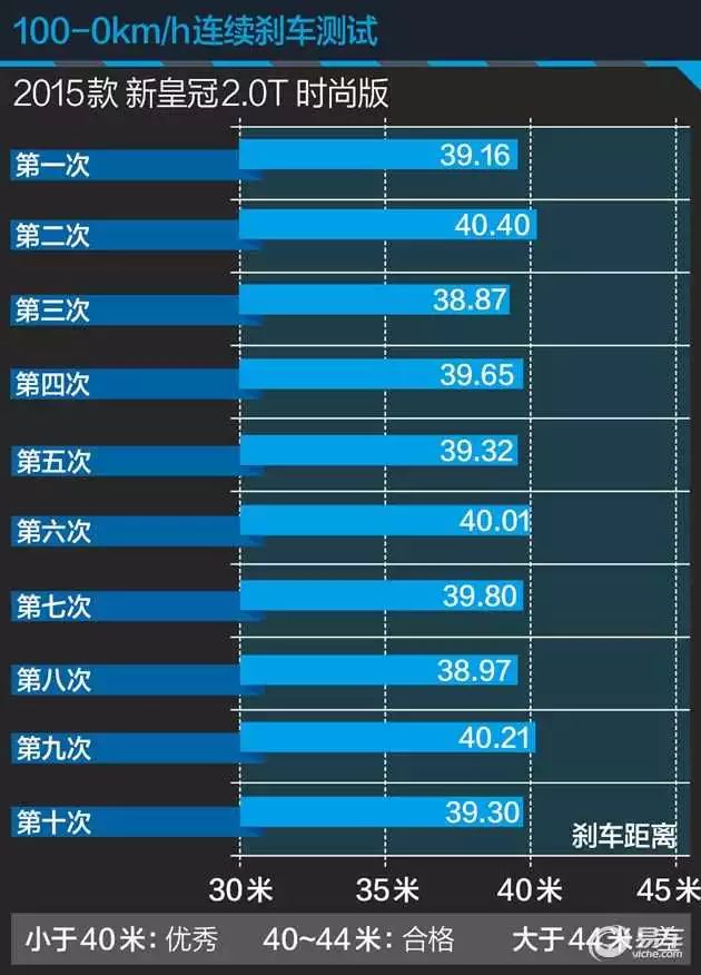 曲线图中,能看出制动力最大限度的释放状态在制动初段,加速度G值一度下探超过-1.1g。并且中、后段都能保持在-1g左右,可见制动力度的释放相当稳定和均匀。从连续10次进行制动的结果来看,成绩基本上都保持在39米左右,热衰减现象并不严重,刹车系统比较可靠。