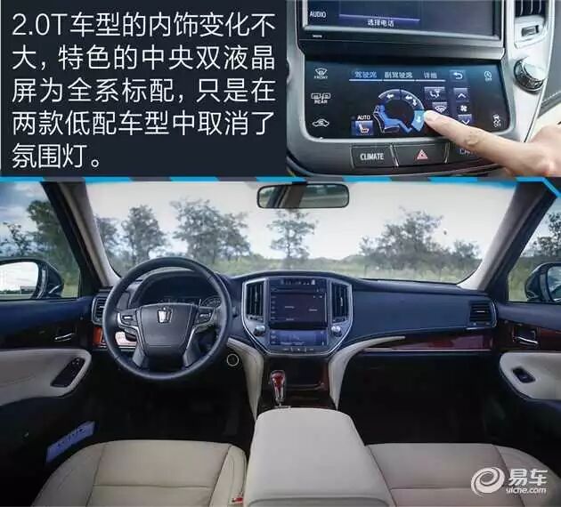 再具体至车型方面,相比于乞丐版车型有拉低售价区间的嫌疑来说,个人认为这台指导价为29.48万元的2.0T 时尚版(次低配)车型的配置已经足够了,也是个人在目前在售的皇冠产品序列中比较推荐的一款车型。如果你对后排功能要求同样并不多的话,那么你可以在这台外观几乎看不出任何差别的2.0T时尚版中找到LED大灯、多功能方向盘、定速巡航等功能,而车内特有的中央双液晶屏同样没有被取消,此外,还拥有胎压监测、ACC自适应巡航等功能,如此的配置想必已经远远超出了“低配”的概念。