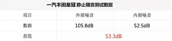 车内降噪对于厂商来说是不可回避的造车能力检验,也是衡量一款车型是否能提供足够舒适度的重要指标,与以往相同,我们仍然采用在皇冠车侧一米处设置人工噪音的方式测试静态下车辆隔音,通过测试可见,得益于诸如前机盖、后尾箱隔音棉以及车门双层密封条等细节处理,相比105.8dB的外部噪音,车内的测量数值达到52.5dB,在同级别车型中已经算是相当不错的成绩了。