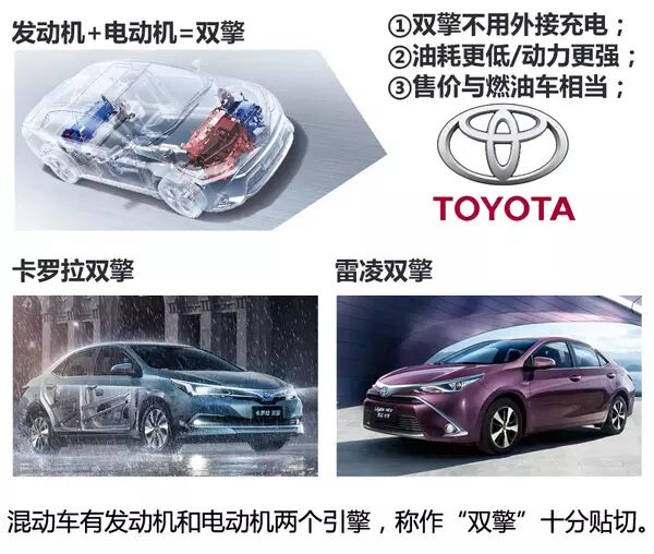 因为混合动力车有发动机和电动机两个引擎,丰田最早称为“油电混动”,但在今天有“电动车充电恐惧症”的中国容易引发歧义,称作“双擎”十分贴切。今天的“双擎”卡罗拉和雷凌已经是第三代混合动力车,属于电力参与动力比例高达53%的“强混”高科技。由于加速时发动机与电动机共同发力,动力叠加,提速的响应超乎期待,在时速20到50公里的中段加速只需3.1秒!做到超低油耗与澎湃动力双赢。双擎的电力完全来自回收的能量,没有外接电源,车主无需改变汽车的使用习惯。