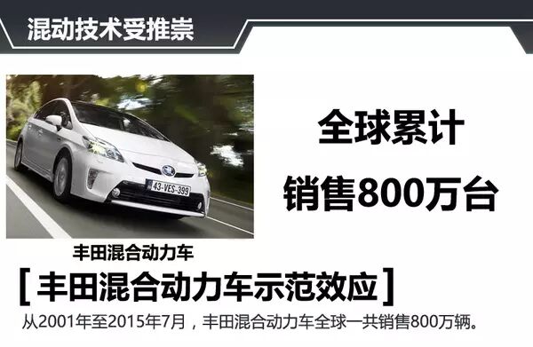 从2001年到2015年7月,丰田混合动力车一共销售800万辆,成为国际口径中的销量最大的新能源车。在丰田混合动力车示范效应启发下,当初并不看好这一技术的欧洲、美国、以及日本其它主流车企也都成功地开发了各自有不同技术亮点的混合动力车型。
