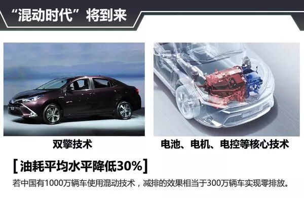 (网通社编者按)“双擎”卡罗拉和雷凌的推出,不仅是一种新产品,更是一个大事件,标志着“混动时代”将接力“T时代”成为中国汽车业新能源车的领跑者。早在世纪之交,混合动力车就作为新能源车列入国家863计划,但是至今仍然没有享受政府补贴。作为一种企业的担当,“双擎”与传统车型差价归零,混动新技术投入的成本,全部由企业消化,无须消费者承担;更加“伟大不止”的是,双擎在当前中国同级别轿车油耗平均水平基础上进一步降低30%,如果中国年销的汽车中的一半1000万辆使用混动技术,节能减排的效果就相当于有300万辆车实现了零耗能,零排放。社会效益有目共睹。