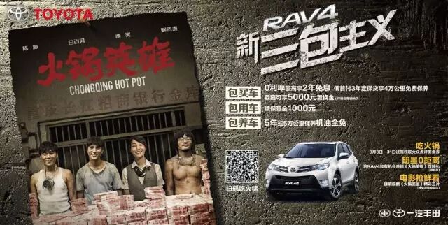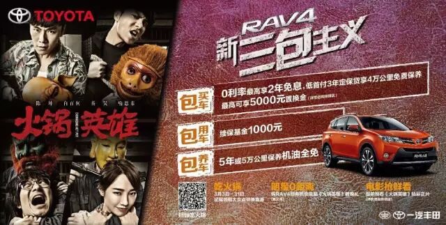 听说还有包吃包看电影的好事儿?即日起只要您进店赏车试驾RAV4就有机会获得《火锅英雄》电影票以及美食劵!近期一汽丰田RAV4与4月即将上映的电影《火锅英雄》深度合作,电影免费看、美食肆意享,当然精彩活动不仅只有看电影吃火锅!一汽丰田RAV4推出了全新的购车大礼:“新三包主义”超值礼包!即日起至4月30日让选购RAV4的消费者得到“包买车”、“包用车”、“包养车”的全新超值体验!让您猴年购RAV4无压力,电影看得爽,火锅吃的香!